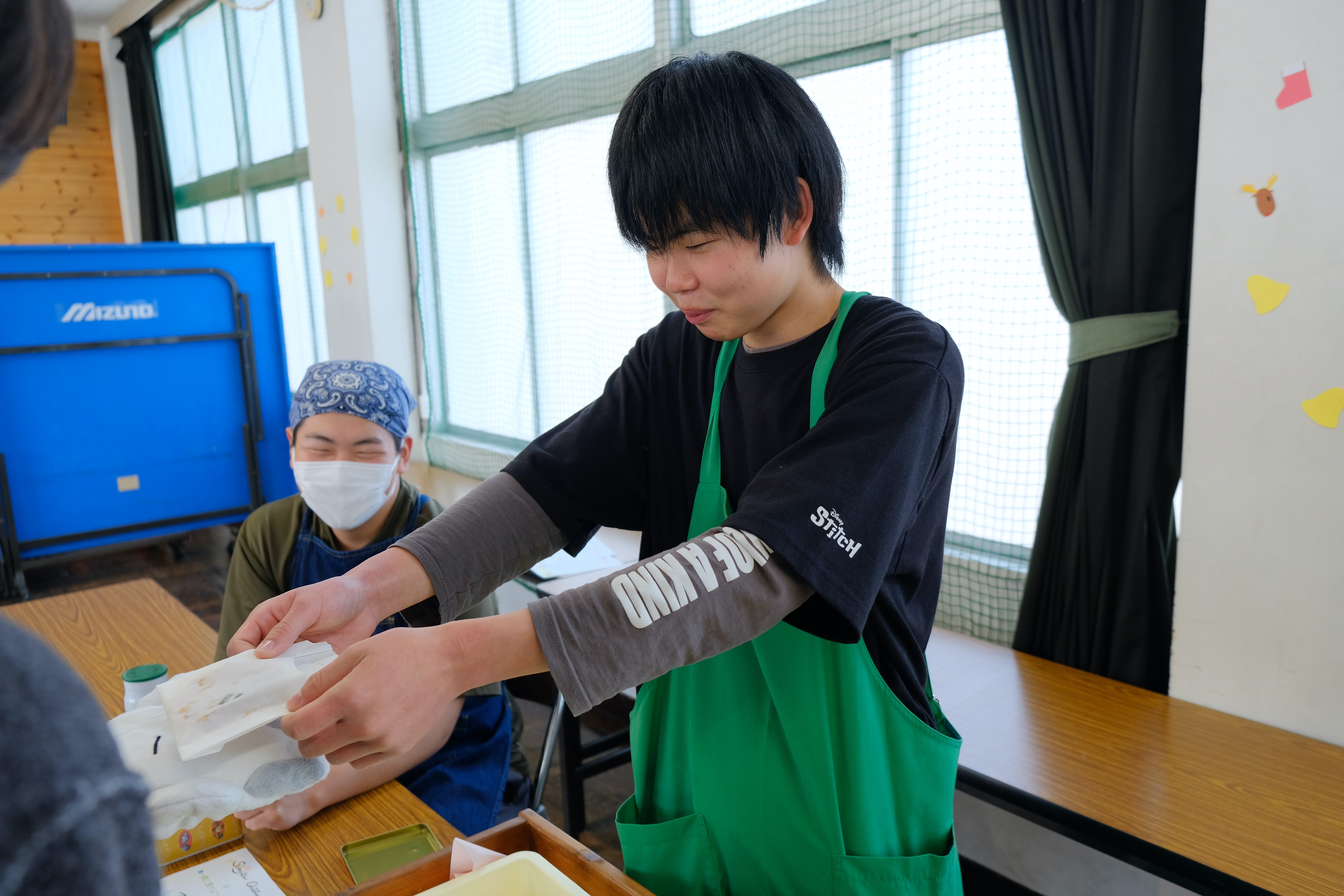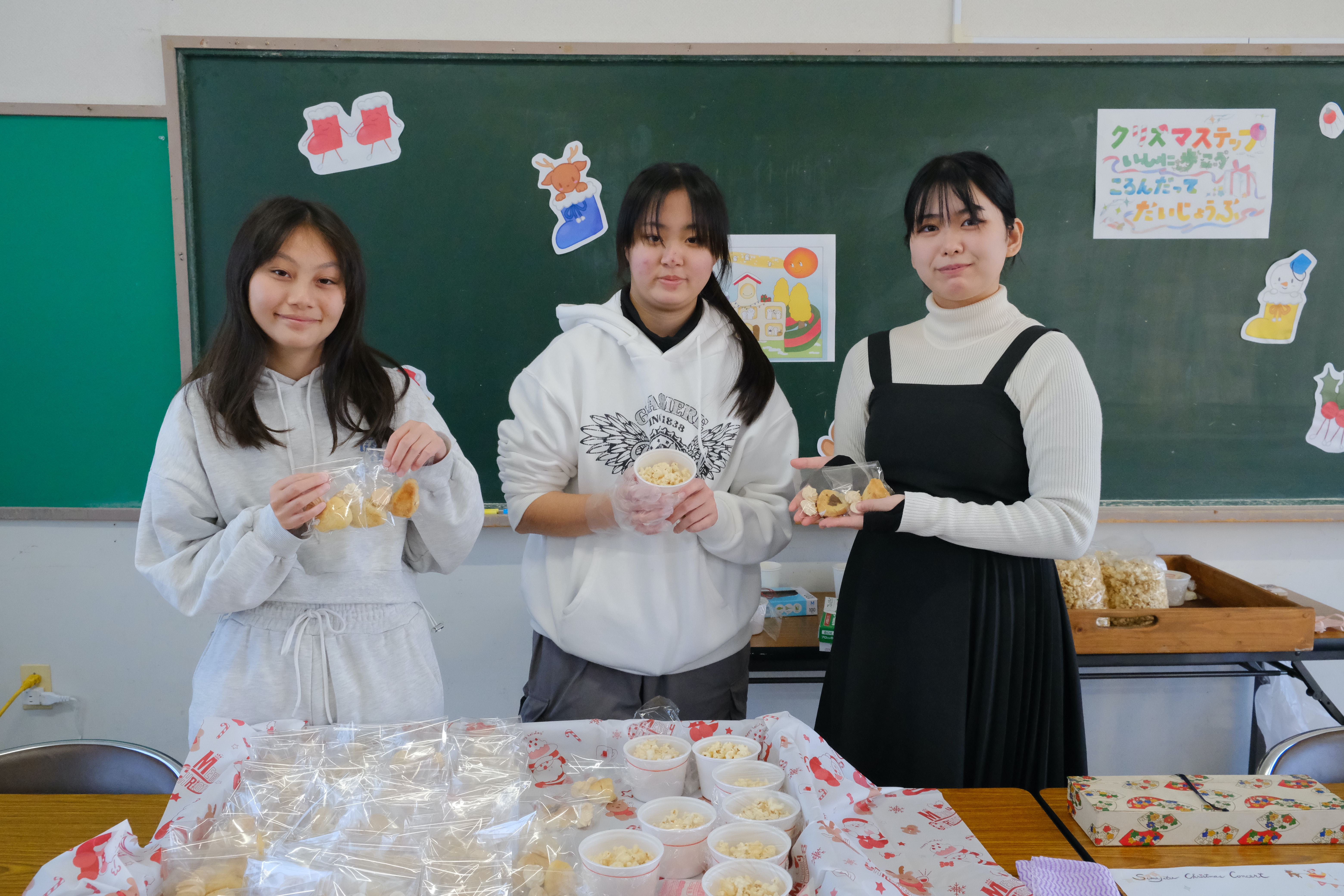 昼食では、シチューとミニピザ、スコーン、キャラメルポップコーンなどの販売がありました。また、来場者へのプレゼントとしてマシュマロクッキーの提供もおこないました。午前中から料理ヘルプの生徒と準備をしていました。どれも美味しく体もこころも満たされました。